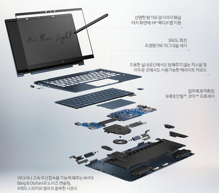 선명한 밝기와 광시야각 패널 , 터치화면에 HP 엑티브 펜 지원이 가능하며 360 회전이 가능한 컨버터블 노트북이며