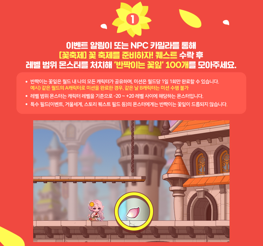 ※ ‘[꽃축제] 꽃 축제를 준비하자!’ 퀘스트는 월드 당 하루에 한 번만 완료할수 있습니다.