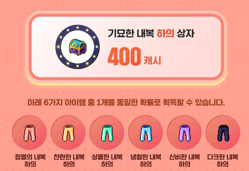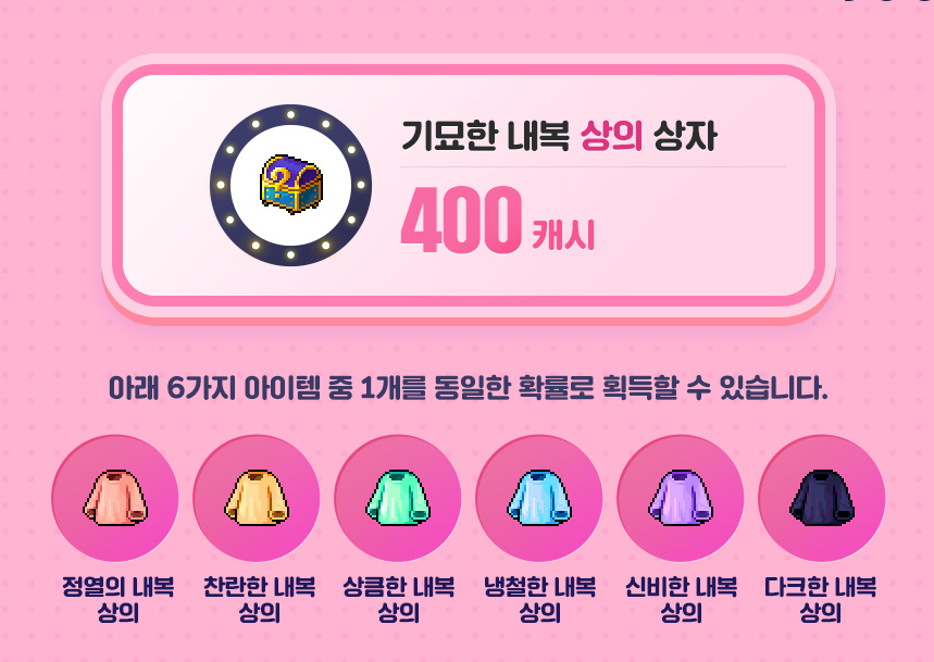 신비한 내복상의 , 다크한 내복상의 6가지 아이템 중 1개를 동일한 확률로 획득이 가능합니다.