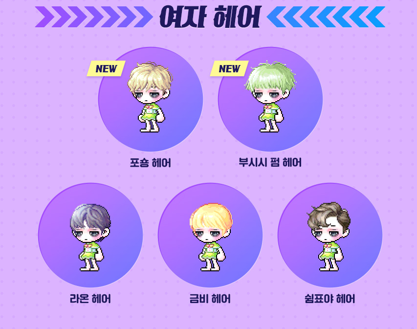 솜이헤어 , 부시시 펌 헤어 , 프림로즈 헤어 , 메블리 헤어 , 리본 블리치 헤어 입니다.