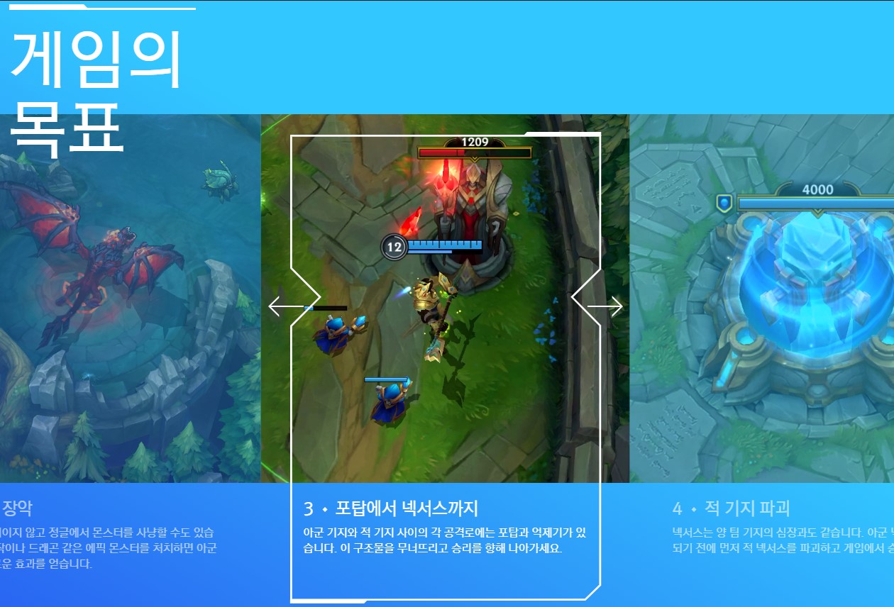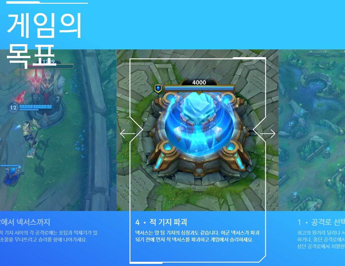 넥서스는 양 팀 기지의 심장과도 같습니다. 아군 넥서스가 파괴되기 전에 먼저 적 넥서스를 파괴하고 게임에서 승리하세요