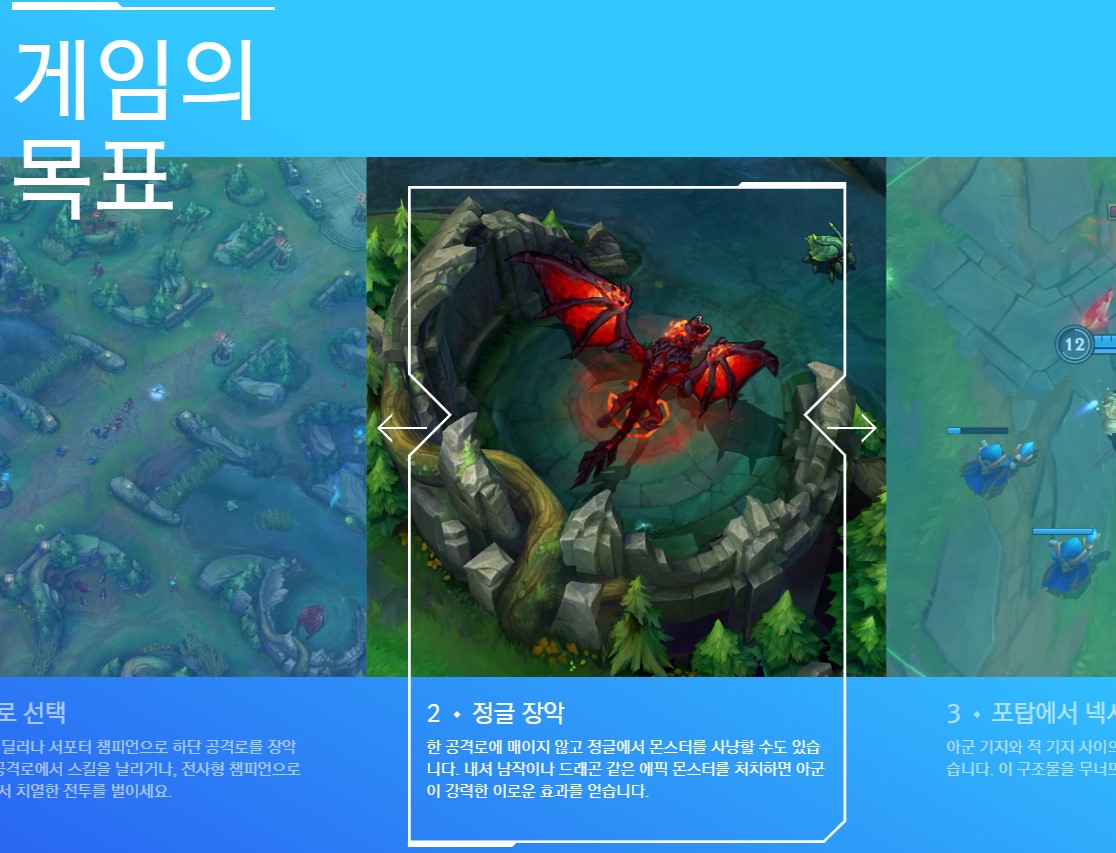 한 공격로에 매이지 않고 정글에서 몬스터를 사냥할 수도 있습니다. 내셔 남작이나 드래곤 같은 에픽 몬스터를 처치하면아군이 강력한 이로운 효과를 얻습니다.