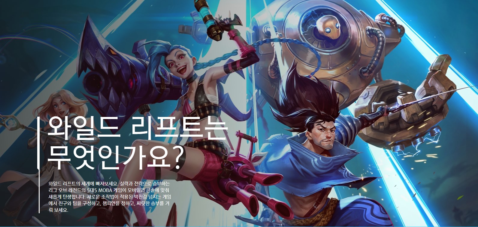 와일드 리프트는 실력과 전력으로 승부하는 리그 오브 레전드의 5대 5 MOBA 게임이 모바일과 콘솔에 맞쳐 새롭게 탄생한 게임입니다. 새로운 조작법이 적용된 박진감 넘치는 게임에서 친구와 팀을 구성하고 챔피언을 정하고 짜릿한 승부를 겨뤄 봅시다.