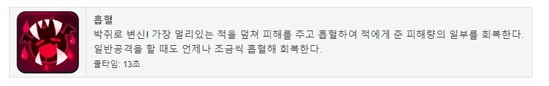 박쥐로 변신해 가장 멀리 있는 적을 덮쳐 피해를 주고 흡혈하여 적에게 준 피해량의 일부를 회복시키는 스킬입니다ㅑ.