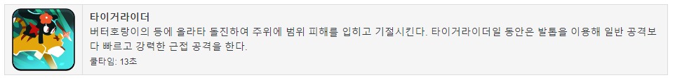 스킬 발동 시 버터호랑이를 불러 타이거라이더로 전환하며 전열로 뛰쳐나가 광역 딜 및 기절을 건다. 이후 타이거라이더 상태일때는 평타가 근거리로 전환되고 기존 체력과는 별개의 서서히 깎이는 추가 체력을 얻는다. 추가 체력이 전부 깎이면 버터호랑이가 물러나고 다시 후열로 돌아온다.