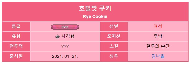 안녕하세요 윤입니다. 오늘은 쿠키런 킹덤 호밀맛 쿠키를 알아보겠습니다. 호밀맛 쿠키는 달달함이 날아간 파수꾼 뱃지를 장식처럼 달고 껍질도 까지 않은 밀알을 마구 쏴대는 호밀맛 쿠키는 그야말로 와일드함 그자체를 풍기고 있습니다. 해가 지면 처음 보는 가게라도 꼭 문을 쾅 열며 등장해 삐뚜름하게 고개를 기울이곤 늘 먹던 걸로 호탕하게 외쳐되는 쿠키입니다.