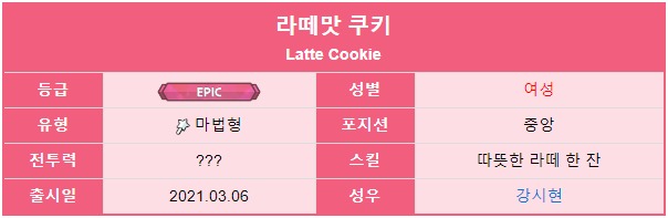 에스프레소맛 쿠키와 함께 커피마법을 연구했다는 설정답게 스킬이 비슷한데 차이점은 에스프레소맛 쿠키는 적을 모으면서 다단히트 후에 한 방 마무리를 가하는 방식이지만 라떼맛 쿠키는 적을 모아 피해를 준 후 장판을 생성하여 지속 피해를 입히는 방식이라는 점이다. 또한 에스프레소맛 쿠키는 범위 안에 있는 적들에게 동일한 데미지를 주지만 라떼맛 쿠키는 가장자리 부분보다 중앙부에 있는 적에게 더 높은 데미지를 준다.