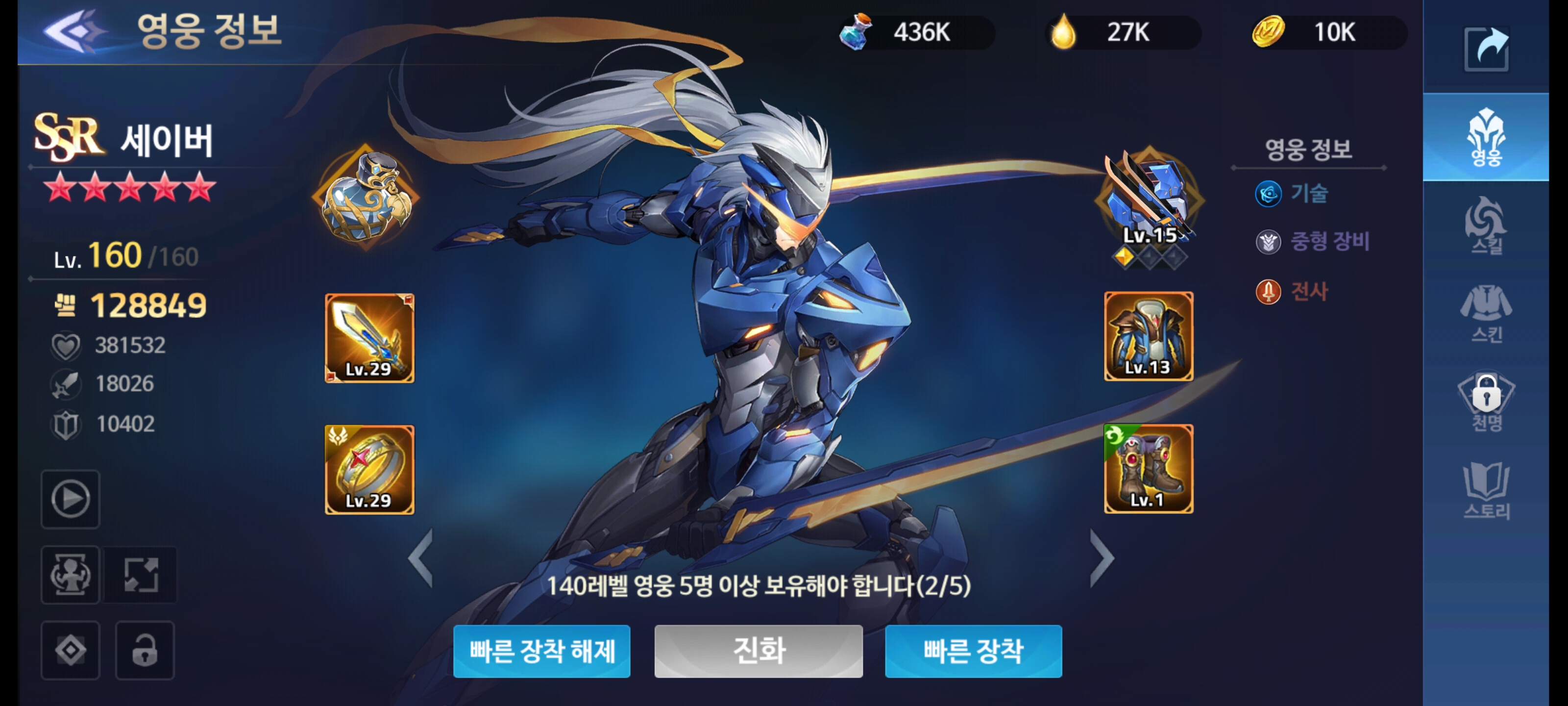 레벨도 160레벨까지 올려줘서 전투력 12만 8천이 되었습니다.