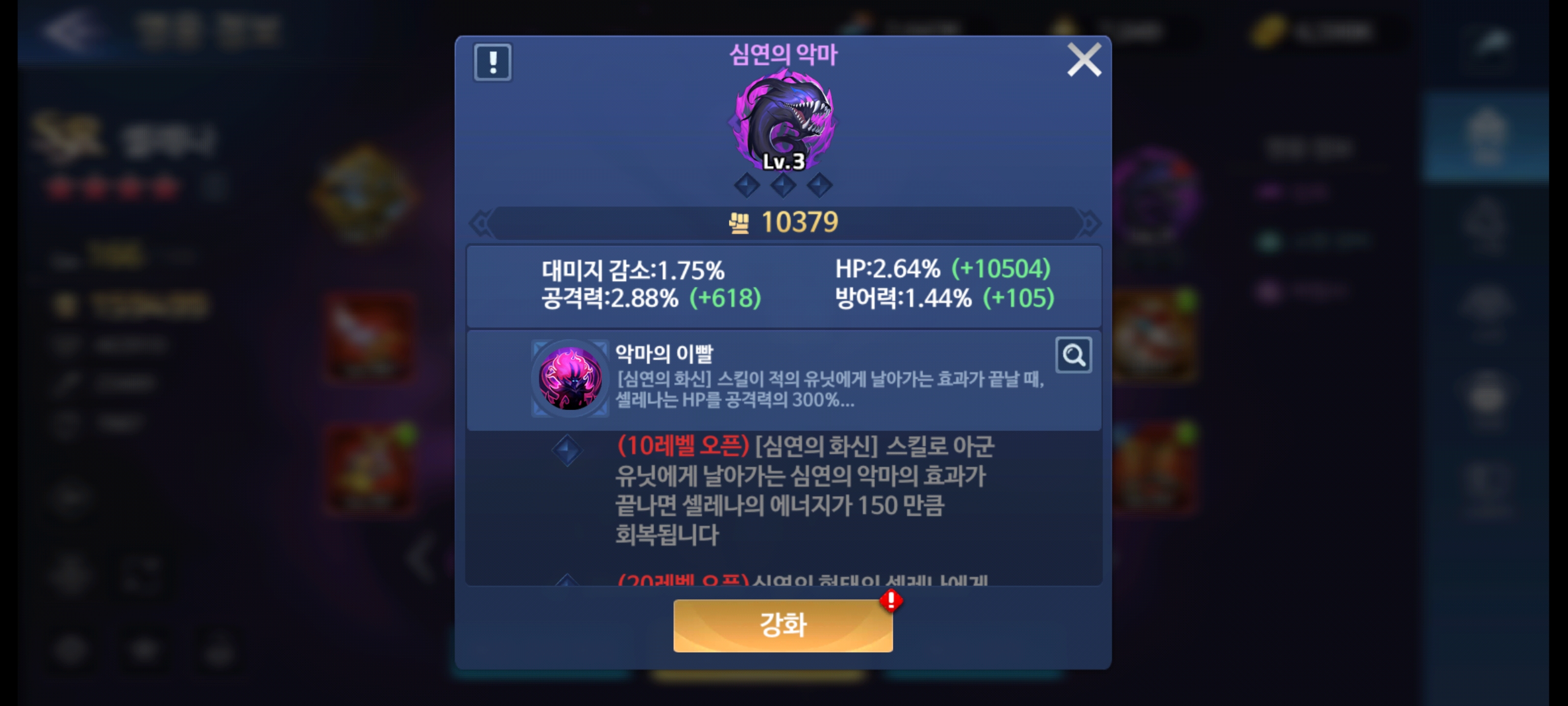셀레나 영혼무기인데요. 현재 3레벨까지 강화했습니다.