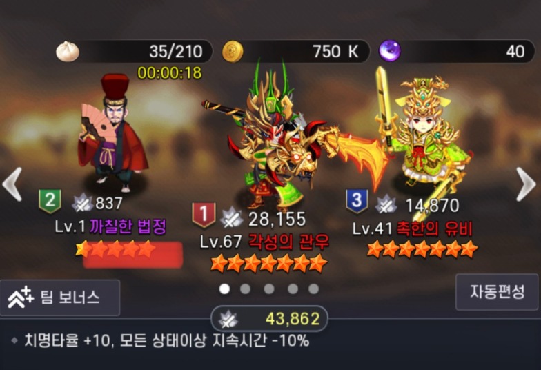 각성 관우 , 유비 법정 입니다. 치명타율 +10 과 모든 상태이상 지속시간 -10% 효과를 얻을 수 있습니다.