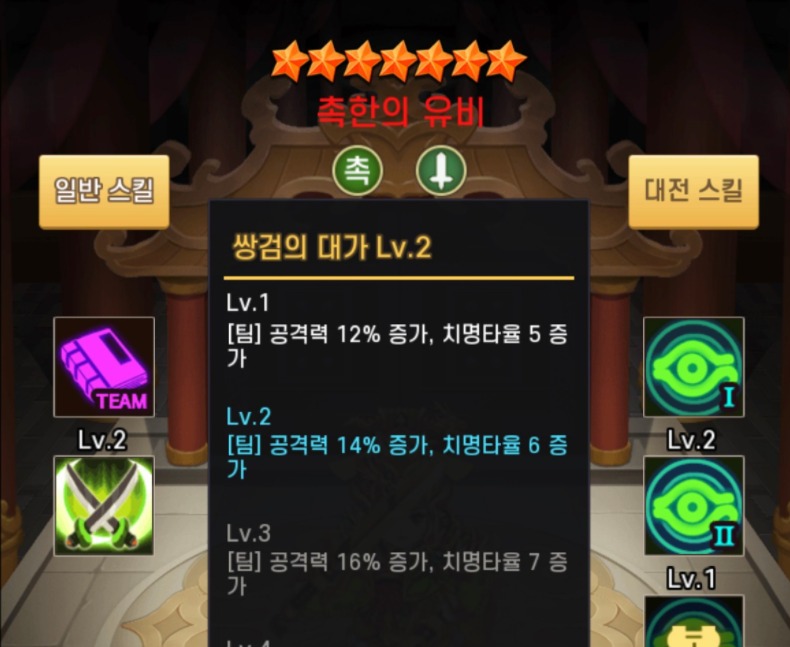 7성 영웅들은 스킬 강화를 할 수 있는데요 7성 유비의 팀 버프입니다.