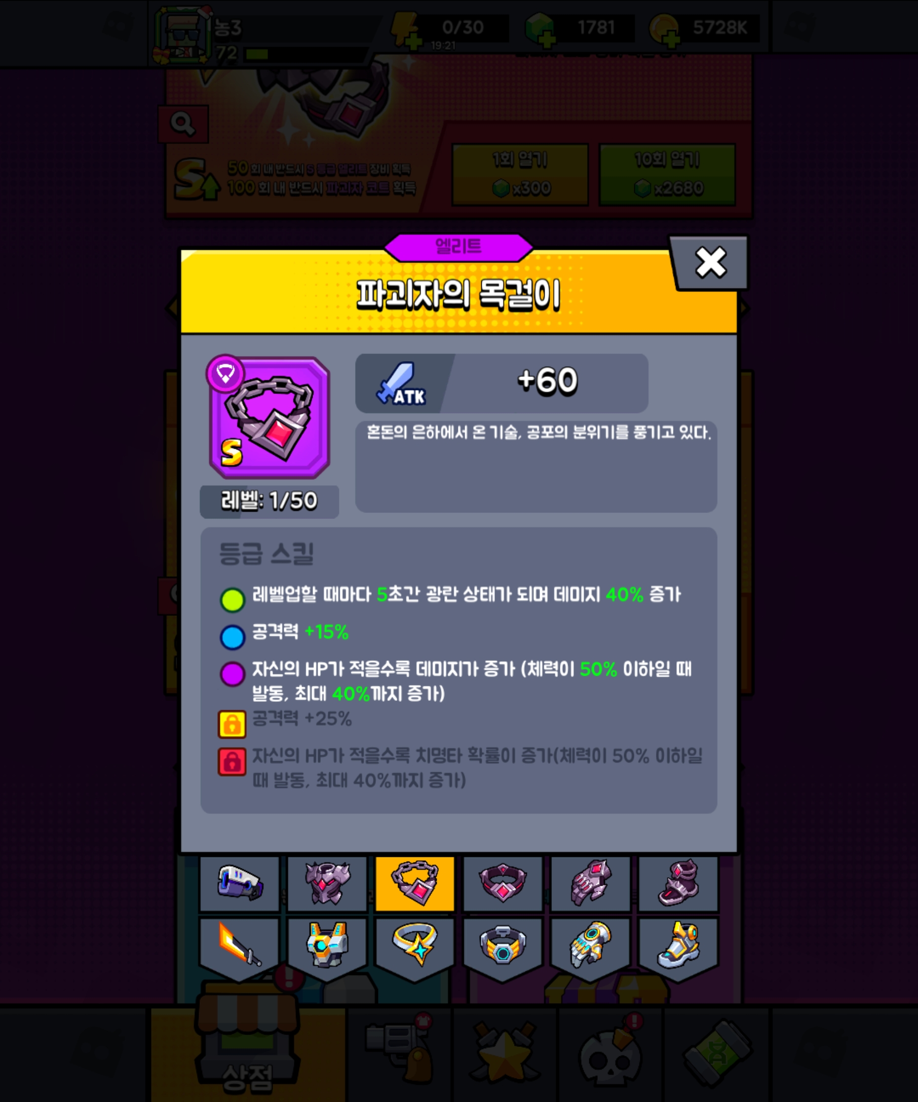 파괴자 목걸이 입니다. 레벨업 할때마다 5초간 광란상태가 되며 데미지 40% 증가 스킬이며.