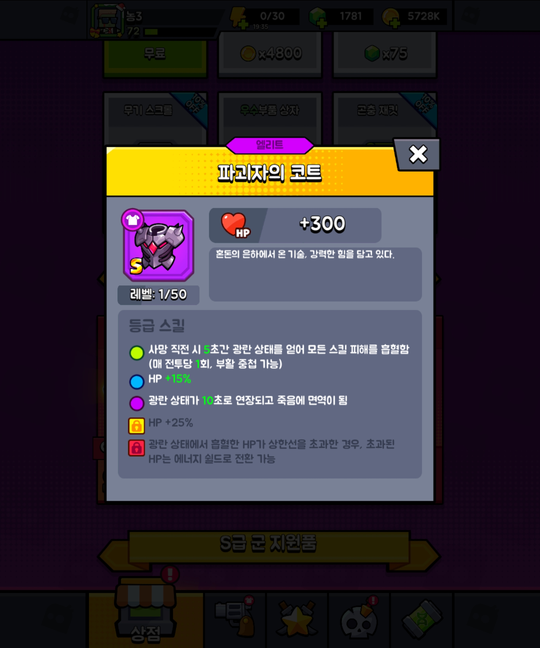 파괴자 코트입니다. 사망직전시 5초간 광란 상태를 얻어 모든 스킬 피해를 흡혈하는 스킬을 가지고 있으며