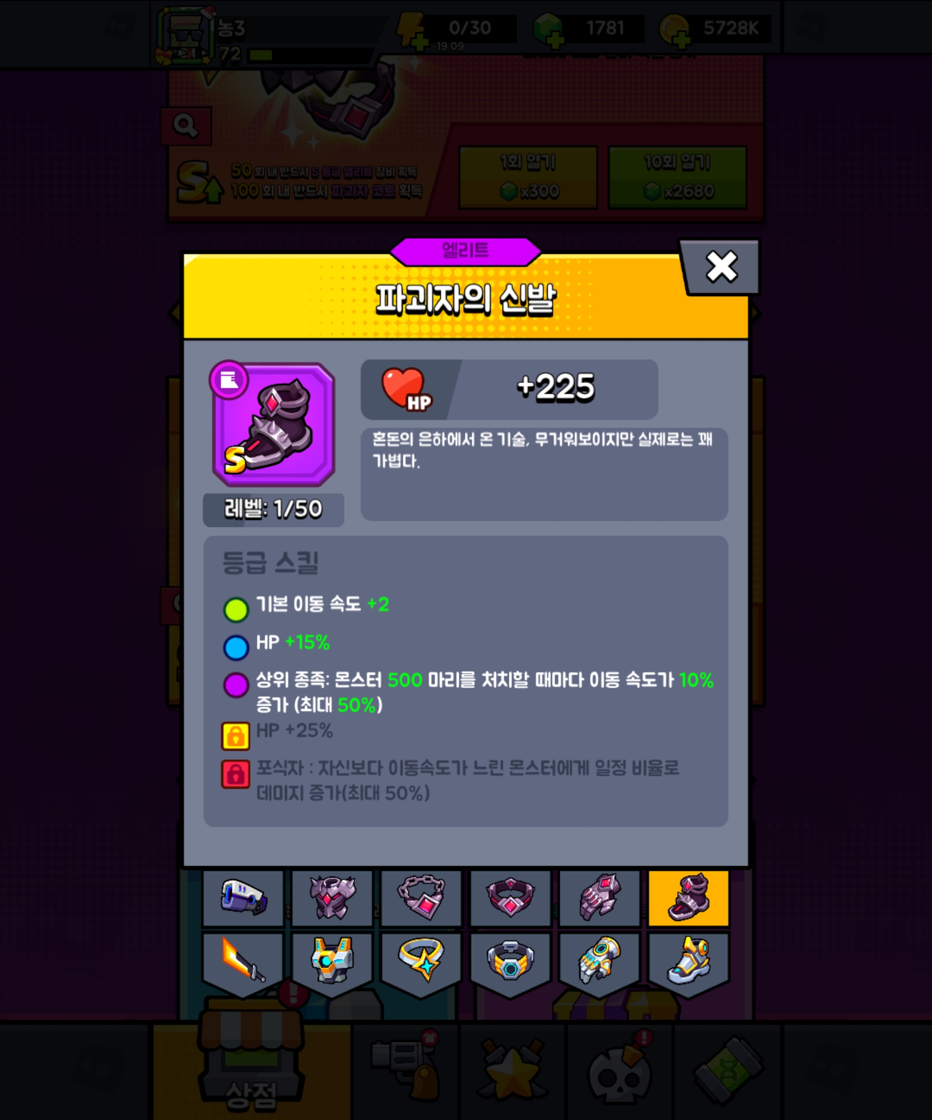 상위 종족 몬스터 500마리를 처치할때마다 이동속도가 10% 증가하며