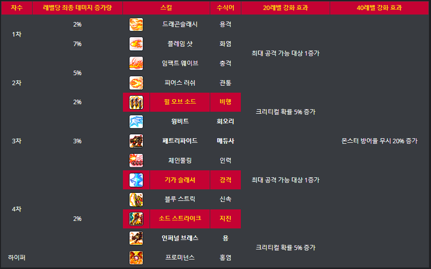 드래곤 슬래셔에 기가 슬래셔 강화 코어의 효과가 적용되기 때문이다. 그러나 본캐로 육성할 생각이라면 위의 3줄 코어를 포함해 페트리파이드/윙비트/인퍼널 브레스까지도 고려하는 것이 좋다. 물론 보스전에서는 윙비트만 유의미한 기여도를 보이므로, 코어 슬롯이 부족하다면 다른 공용 스킬 코어를 끼워 써도 된다