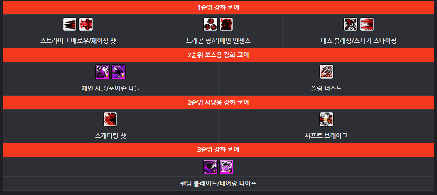 가짓수는 8가지로, 모든 강화 코어가 유효하다. 하지만 이는 완전한 강화 기준이고, 중하위 보스 돌이를 목적으로 약식 강화를 노린다면 스트라이크 애로우/체이싱 샷, 드래곤 팡/리메인 인센스, 데스 블레싱/스니키 스나이핑 정도면 충분하다. 물론 카인의 화력은 여러 스킬에 골고루 퍼져 있으므로, 약식 강화만으로는 한계가 명확할 수밖에 없다.