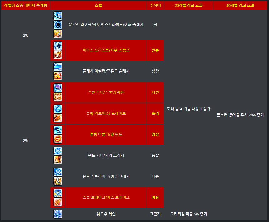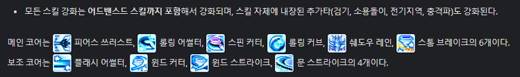모든 스킬 강화는 어드밴스드 스킬까지 포함해서 강화되며, 스킬 자체에 내장된 추가타(검기, 소용돌이, 전기지역, 충격파)도 강화된다.