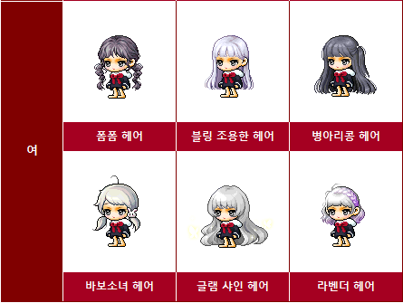 로얄헤어 여성헤어이구요 폼폼헤어 , 블링 조용한헤어 , 병아리콩헤어 , 바보소녀헤어 . 글램샤인헤어 , 라벤더헤어 입니다.