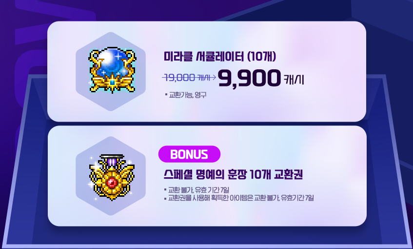 미라클 서큘레이터 10개와 스페셜 명예의 훈장 10개를 지급합니다.