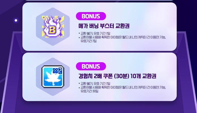 보너스로 메가버닝 부스터 교환권 . 경험치 2배 쿠폰 10개 교환권을 얻을 수 있습니다.