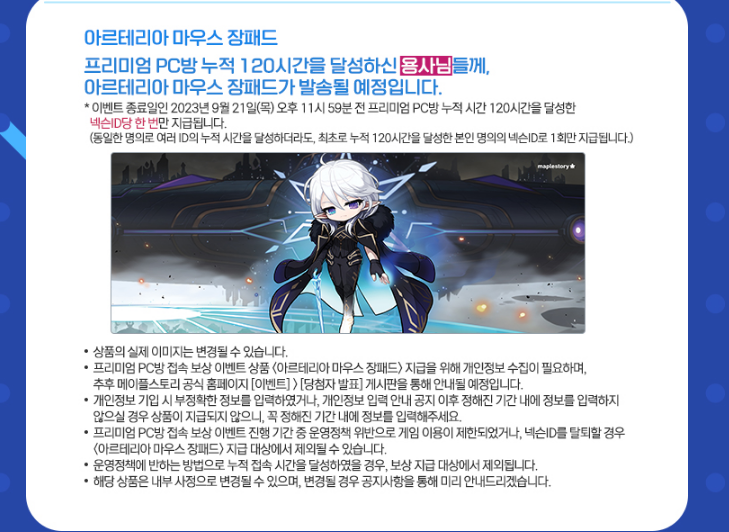 120시간 보상으로는 아르테리아 마우스 장패드와 let's maple 칭호 교환권을얻으실 수 있습니다.