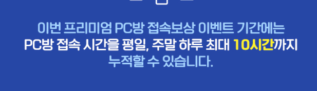 이번 프리미엄 pc방 접속보상 이벤트기간에는 평일 주말에 하루 최대 10시간까지 누적이 가능합니다.