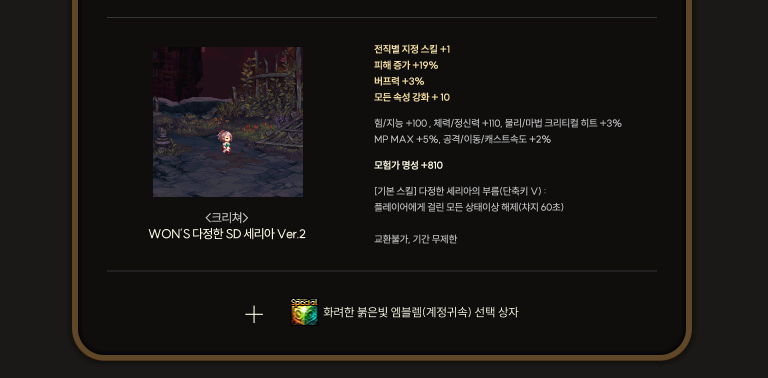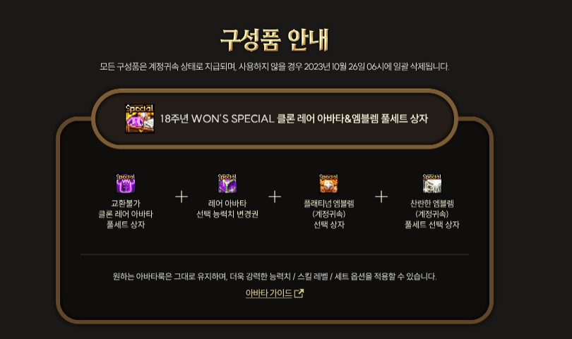 18주년 원 스페셜 기프트는 클론레어 아바타&엠블렘 풀세트 상자와 버프강화아파타 상하의 플레티넘엠블렘세트상자