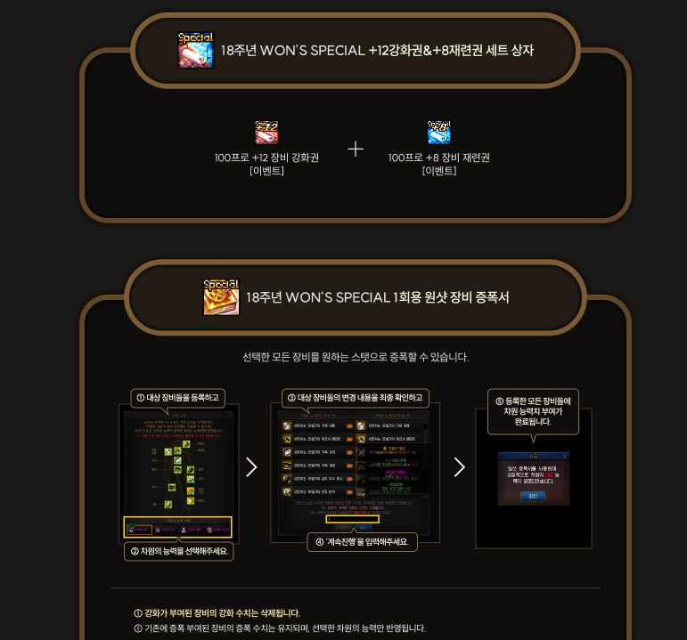 원 스페셜 +12 장비 강화권 , +8 장비 제련권 과 1회용 원샷 장비 증폭서도 지급합니다.
