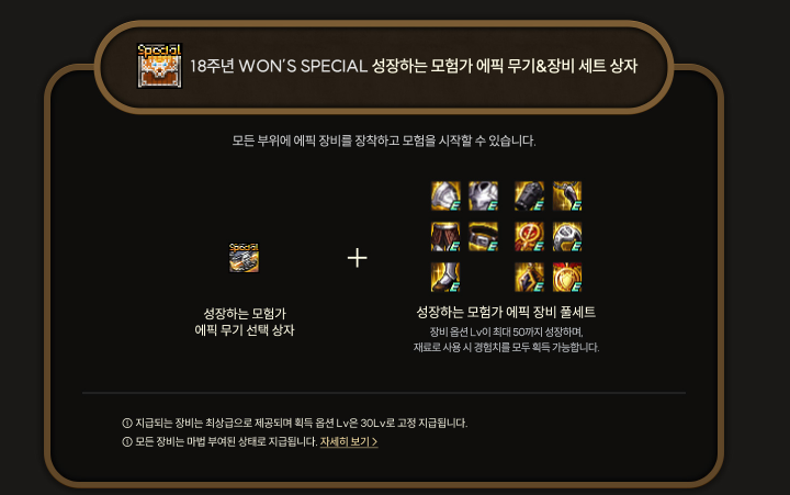 성장하는 모험가 에픽 무기 선택상자와 성장하는 모험가 에픽 장비 풀세트