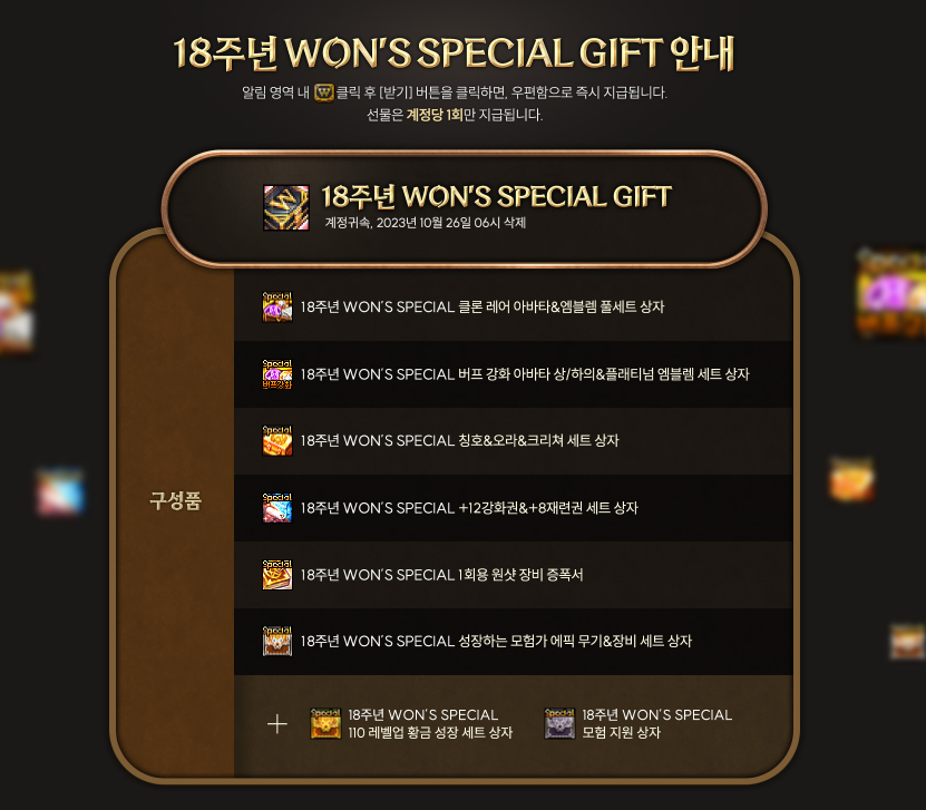 18주년 칭호/오라/크리쳐 세트상자 , 18주년 +12성강화권/+8재련권세트상자 , 18주년 1회용 원샷장비증폭서 , 18주년 성장하는모험가에픽무기,장비세트상자로 되어 있습니다. 선물은 계정당 1회만 지급이 됩니다.