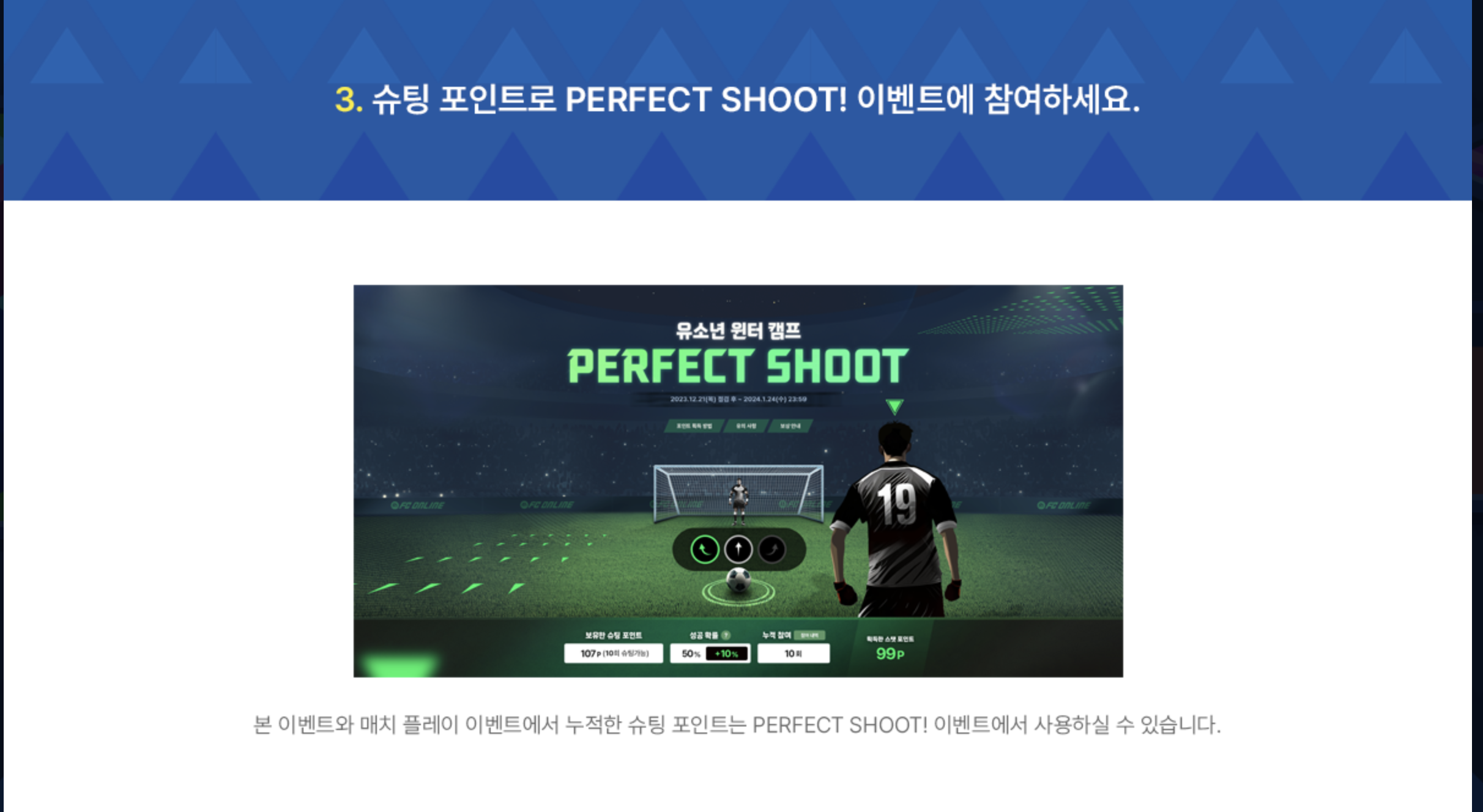 이후 슈팅 포인트 10p 를 이용하여 승부차기를 하실 수 있으며 승부차기에서 획득한 스탯 포인트로 STATUS UP 이벤트에 참여하여 한번 . 더보상을 받을 수 있는 구조 입니다.