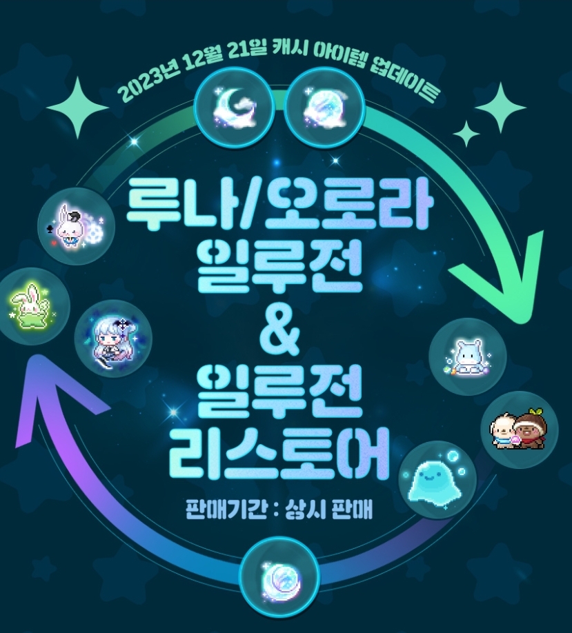 안녕하세요 농이입니다. 오늘은 메이플스토리 캐시아이템업데이트소식입니다. 신규아이템이 출시했습니다. 루나.오로라 일루전 과 일루전 리스토어가 판매되는데요