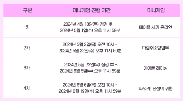 미니게임은 각 기간마다 변경이 되며 현재는 메이플 사커 온라인을 플레이하실 수 있습니다.