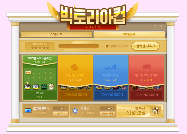 빅토리아컵 컬렉션북입니다. 미니게임 3판 클리어 시 컬렉션을 채울수 있습니다. 매주 최대 5번까지 출석이 가능합니다.