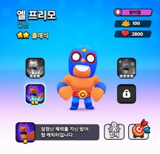 엘 프리모입니다. 엘프리모는 브롤스타즈에서도 탱커 캐릭터로 알고 있는데 이게임에서도 방어형 캐릭터로 나왔습니다. 엄청난 체력을 지닌 방어형 캐릭터이기에 탱커로서 잘 활용할 수 있습니다.