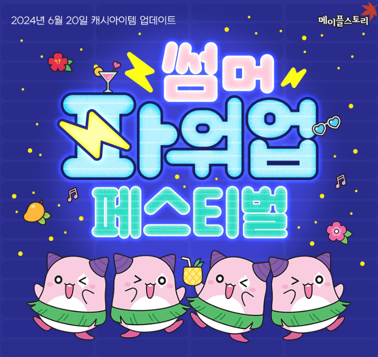 안녕하세요 농이입니다. 오늘은 메이플스토리 캐시아이템업데이트소식입니다 .오늘은 썸머 파워업 페스티벌 업데이트 소식입니다. 여름 이벤트와 함께 메이플스토리에 필요한 캐시아이템을 판매하는것같은데요. 한번 알아보겠습니다.