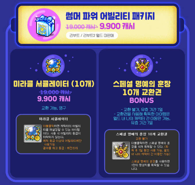 썸머 파워 부스트 링 패키지입니다. 경험치 부스트 링과 혈맹의 반지를 받을 수 있습니다. 사용기간은 한달로. 가격은 2만원입니다. 경험치 부스트링 저번이벤트때 공짜로 지급받앗던것으로 기억합니다.