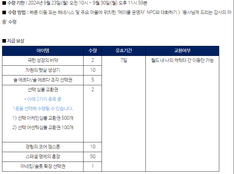 이건 메이플스토리 한국소비자원 보상 전체유저분들에게 주는 겁니다. 23일부터 30일까지 받을 수 있는 보상이구요 메이플 운영자 NPC 에게 대화를 걸어 받으실 수 있습니다. 극성비 2개와 차원의 햇살생성기 , 솔에르다/ 조각 선택권 5개 와 선택심볼 교환권 , 경코젬 10개 등을 받을 수 있습니다.