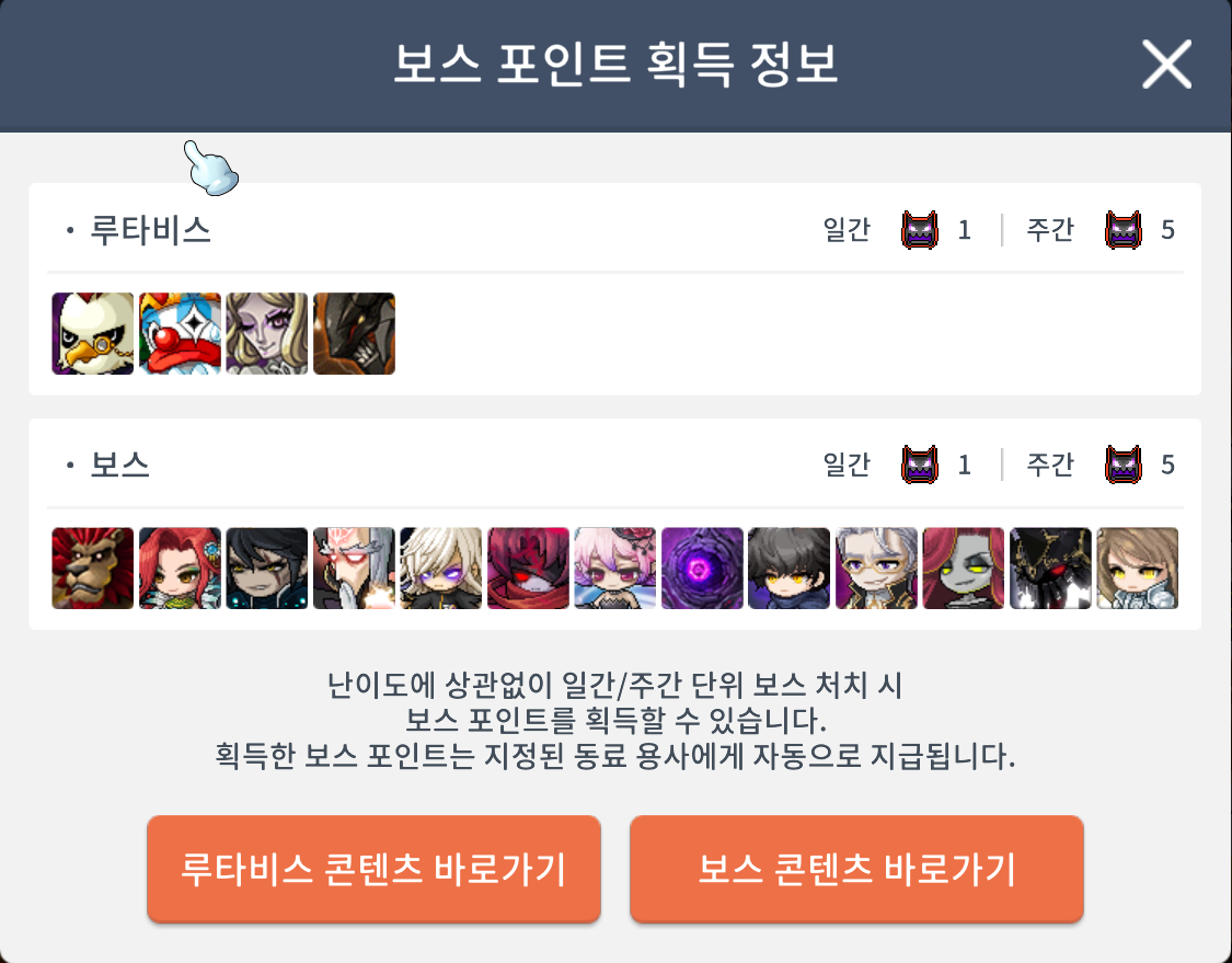보스포인트는 리더용사가 보스처치시 얻으실 수 있습니다. 루타비스와 군단장 보스를 처치해야 하며 ,. 일간 보스와 주간보스에 따라 얻을 수 있는 포인트갯수가 다릅니다. 일간 보스의경우 1개로 동일하며 , 주간보스의 경우 5개를 얻으실 수 있습니다.