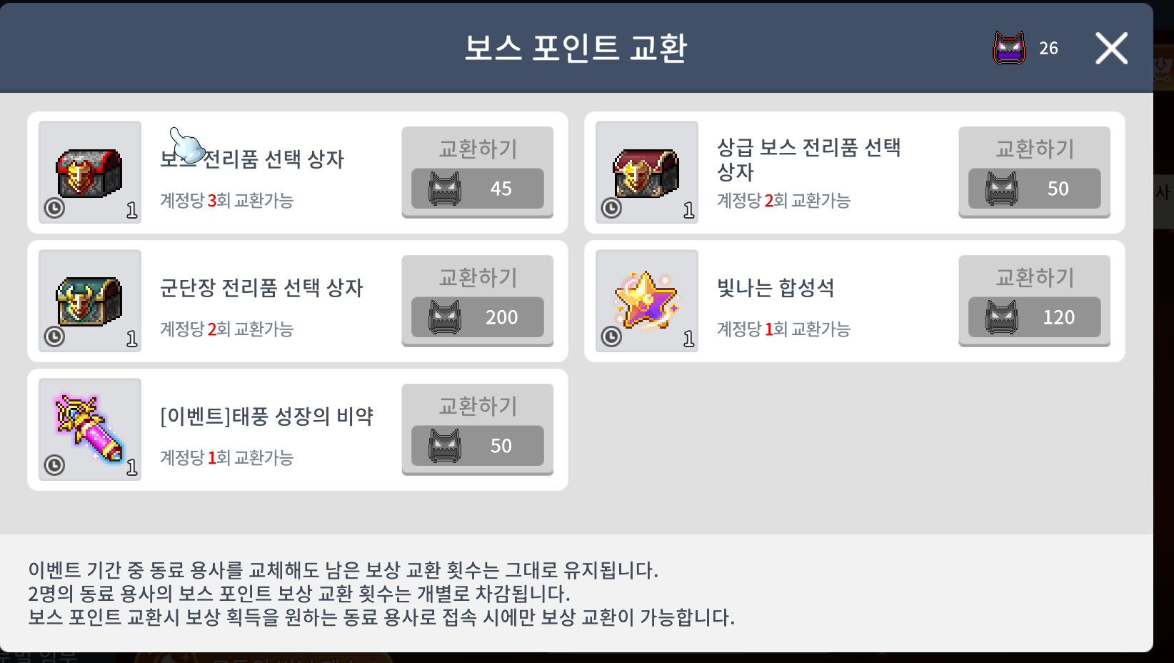 성장포인트로 레벨에 따른 경험치 보스포인트로 보스 장신구 교환 |