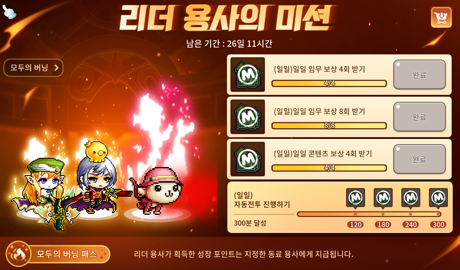 | 경험치 획득량 50% 일일임무 & 콘텐츠 경험치 획득량 150% 추가 |